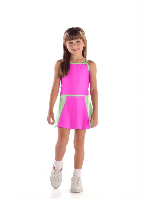 Este conjunto esportivo infantil feminino é perfeito para acompanhar as meninas nas atividades do dia a dia. A regata tem modelagem ajustada e acabamento reforçado. A saia com short embutido proporciona liberdade de movimento com segurança, enquanto o aplique termocolante refletivo traz mais estilo e visibilidade. Produzido em (Poliamida com elastano), garante conforto e respirabilidade em todas as ocasiões.