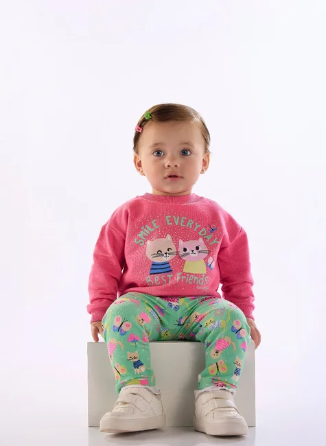 Ideal para os dias frios, este conjunto de inverno para bebê menina combina conforto e charme. O blusão é feito em moletom felpado, além de estampa frontal com strass que adiciona um toque delicado. Acompanha legging em super cotton felpado), com estampa colorida e divertida, perfeita para dar liberdade aos movimentos. Uma escolha prática e estilosa para aquecer sua pequena com conforto.