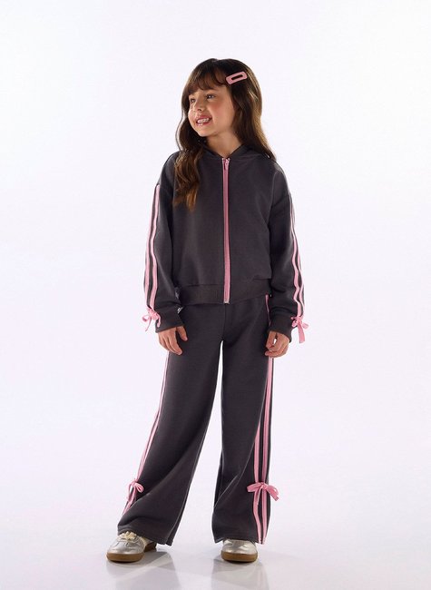 Ideal para os dias mais amenos, este conjunto infantil feminino combina conforto e estilo. A jaqueta com capuz é confeccionada em moletom sem felpa (50% algodão, 50% poliéster), com fechamento por zíper e detalhe de filetes contrastantes nas mangas, além de laços decorativos nos punhos que adicionam charme ao look. A calça segue a mesma proposta, com modelagem reta, cós com elástico largo e filete lateral, garantindo liberdade e praticidade no dia a dia.