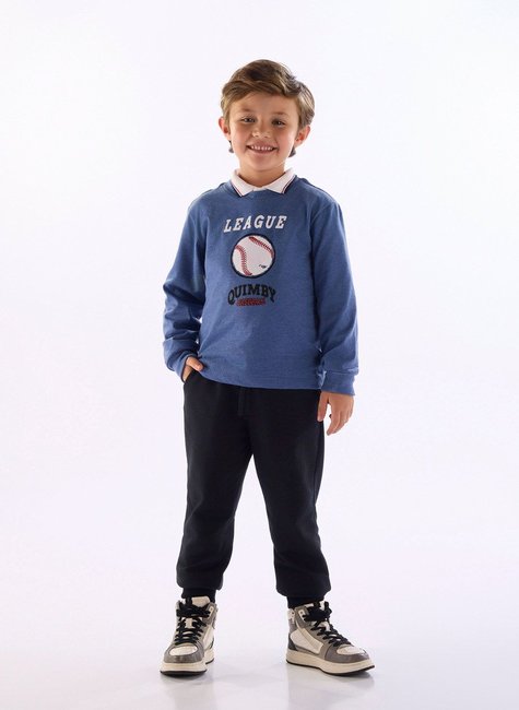 Conjunto infantil masculino composto por blusa em meia malha com estampa esportiva e calça em moletom sem felpa. A calça possui cós com elástico rebatido, bolso funcional e cadarço decorativo com acabamento em pesponto. Um look versátil e confortável para o dia a dia dos meninos.