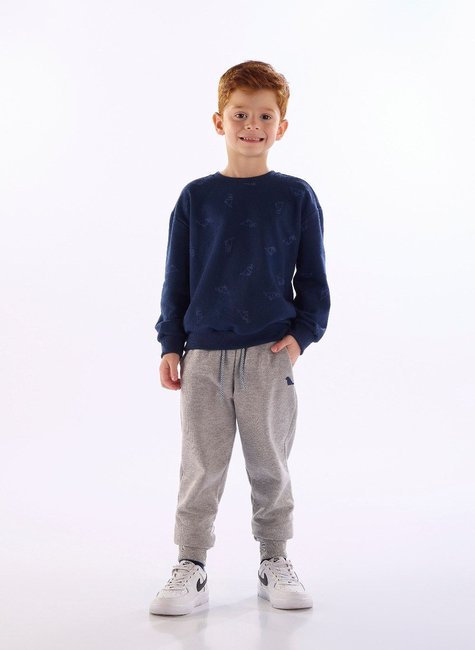 O conjunto infantil masculino é ideal para os dias frios, combinando conforto e estilo. O blusão é confeccionado em moletom felpado com estampa relevo, possui decote com acabamento em filete e detalhe de debrum aplicado, garantindo melhor durabilidade. A calça, produzida em moletom macio e resistente, conta com cós largo com elástico rebatido, bolso funcional, cadarço decorativo e aplique termocolante. Um look moderno e funcional, perfeito para o dia a dia das crianças.