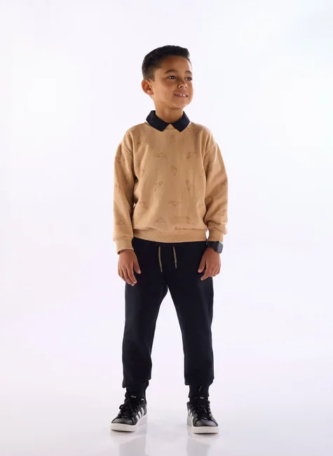 O conjunto infantil masculino é ideal para os dias frios, combinando conforto e estilo. O blusão é confeccionado em moletom felpado com estampa relevo, possui decote com acabamento em filete e detalhe de debrum aplicado, garantindo melhor durabilidade. A calça, produzida em moletom macio e resistente, conta com cós largo com elástico rebatido, bolso funcional, cadarço decorativo e aplique termocolante. Um look moderno e funcional, perfeito para o dia a dia das crianças.