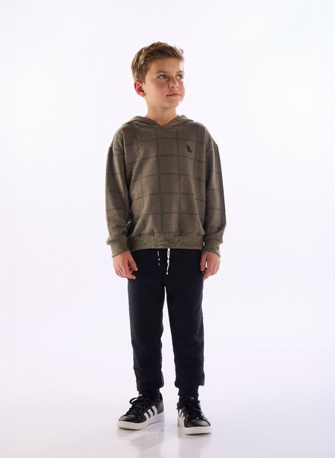Este conjunto infantil masculino une estilo e conforto de forma equilibrada. O blusão em moletom rotativo traz estampa xadrez moderna, capuz com acabamento pespontado e aplique emborrachado termocolante. A calça, confeccionada em moletom sem felpa, possui toque leve, cós com elástico rebatido, bolso funcional e cadarço decorativo com costura aparente. Um look completo e prático, ideal para os dias mais amenos e para a rotina do dia a dia.