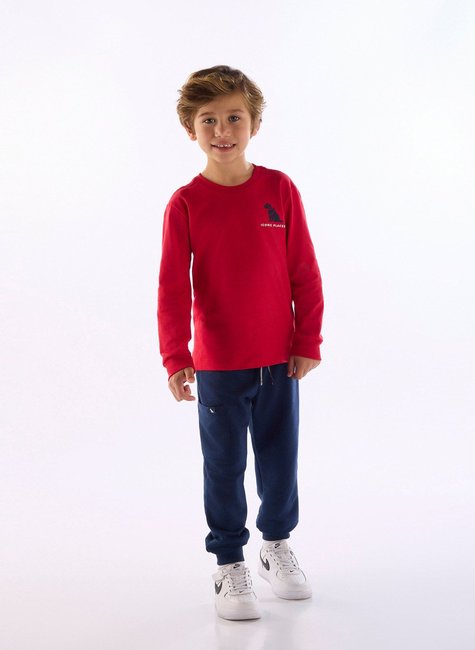 Conjunto infantil masculino composto por blusa em meia malha 100% algodão, com estampa localizada com efeito 3D e acabamento em debrum nos ombros e na barra. A calça é confeccionada em moletom, possui bolso funcional sobreposto, cós com elástico rebatido e detalhe em cadarço decorativo. Ideal para os dias frios, oferecendo conforto e praticidade.