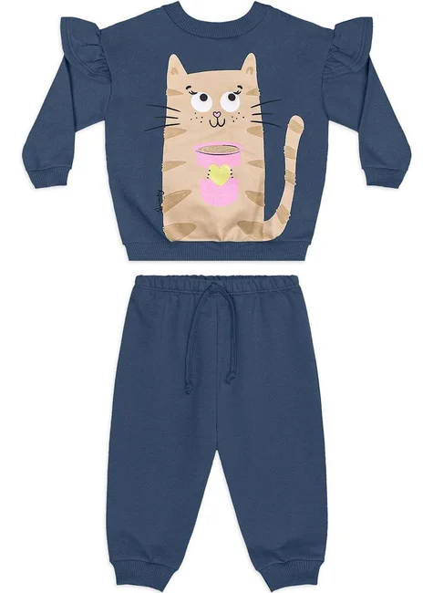 Este conjunto para bebê menina é perfeito para os dias de meia-estação, unindo conforto e delicadeza em cada detalhe. O blusão em moletom sem felpa traz estampa fofa de gatinho e babado franzido nas mangas, oferecendo um toque charmoso ao visual. A calça, também em moletom, tem cós elástico com laço decorativo, garantindo ajuste confortável para a rotina da sua pequena. Um look completo, ideal para o dia a dia com muito estilo e praticidade.