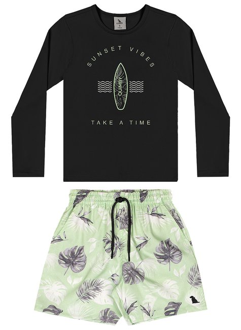 Ideal para o verão, este conjunto praia infantil masculino garante proteção e liberdade de movimento. A camiseta de manga longa em malha UV tem FPS 50+ (Poliéster com elastano), possui leveza e elasticidade. A bermuda boxer em microfibra com elastano (Poliéster com elastano) possui estampa sublimada, cós com cadarço funcional, aplique 3D. Uma opção prática e estilosa para piscina, mar e momentos ao ar livre.