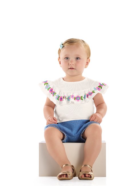 Conjunto para bebê menina, composto por uma blusa em meia malha de algodão e uma calcinha em jeans com elastano. A blusa possui gola arredondada em ribana e um delicado recorte com babado franzido e sobreposto com estampa de flores. A calcinha jeans garante um ajuste confortável e flexível, com elástico na cintura e nas pernas. É uma proposta que une conforto e estilo, perfeita para passeios e momentos especiais.