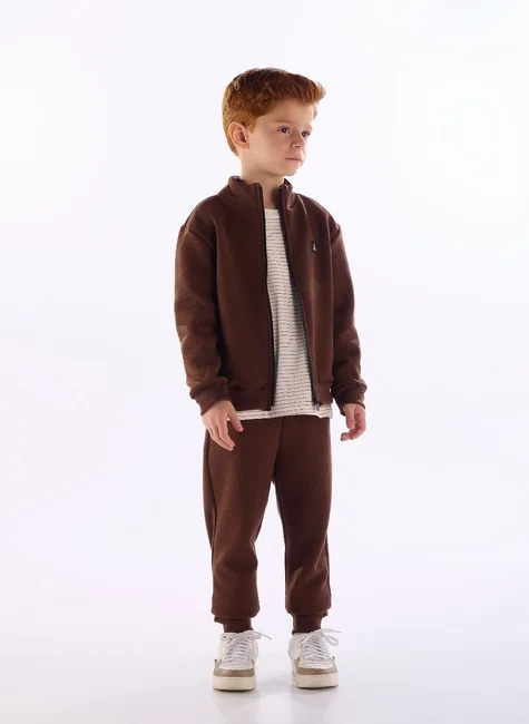 Conjunto infantil masculino confeccionado em jacquard texturizado, com toque encorpado e confortável. O blusão possui gola alta, filete aplicado no decote das costas e fechamento frontal em zíper aparente com acabamento limpo. A calça segue o mesmo tecido e apresenta cós com elástico, cadarço decorativo e punhos ajustados. Ideal para os dias frios, unindo conforto e estilo.