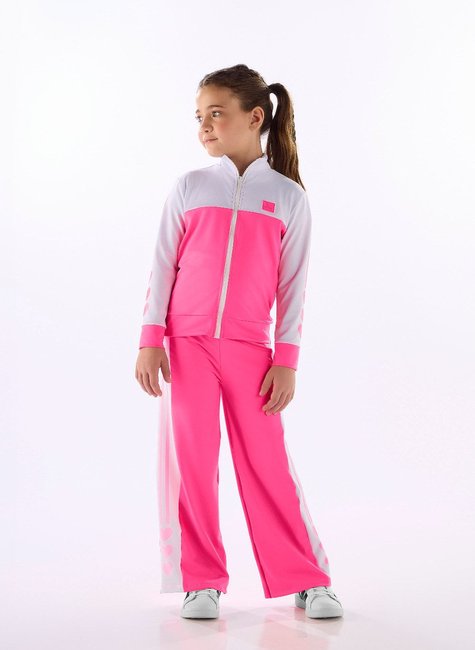 Jaqueta infantil feminina em malha sport com elastano, ideal para os dias frios. Possui gola dupla, punhos e barra em molde, estampa sublimada nos recortes e nas mangas com desenho de corações, além de zíper destacável e etiqueta decorativa.