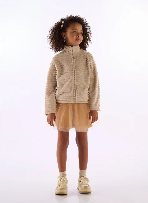 Essa jaqueta infantil feminina em pelo sintético é perfeita para os dias frios. Com tecido macio e quentinho, ela oferece conforto térmico e muito estilo. Possui gola dupla, fechamento com zíper aparente e medalha decorativa no peito, dando um charme delicado à peça. Ideal para compor looks de inverno com saias, calças ou vestidos.