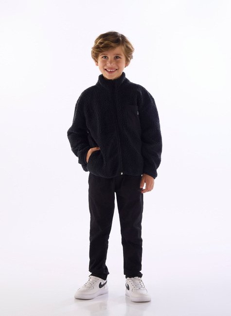 Jaqueta para menino que garante conforto térmico, praticidade e visual moderno. Confeccionada em pelo sintético de poliéster. Possui gola alta, zíper frontal com acabamento limpo e bolsos laterais funcionais aplicados em tecido microfibra de poliéster com elastano, ideais para aquecer as mãos ou guardar pequenos objetos. Conta ainda com um bolso no peito com bainha embutida. Os punhos e a barra com elástico embutido proporcionam melhor ajuste e maior proteção contra o vento. Perfeita para passeios ao ar livre ou momentos de lazer, é um look que une estilo, funcionalidade e bem estar para o inverno do seu pequeno.