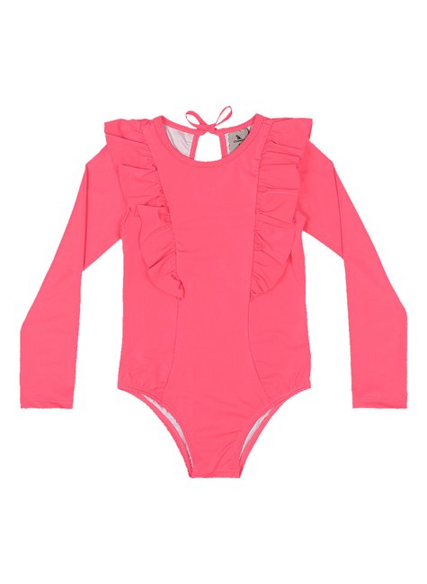 Maiô infantil com manga longa, ideal para curtir os dias de sol com segurança e estilo. Confeccionado em malha UV Dry (poliéster com elastano), conta com proteção solar FPS 50+, garantindo cuidado extra para a pele sensível das pequenas. A peça possui forro interno frontal e traseiro, elástico embutido nas cavas e acabamento com bainha reforçada, oferecendo conforto e ajuste perfeito ao corpo. O destaque fica por conta dos babados frontais com recorte franzido, que adicionam charme e delicadeza ao visual. Uma opção funcional e encantadora para praia, piscina ou atividades ao ar livre.