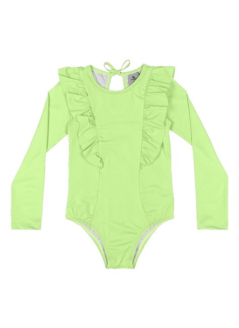 Maiô infantil com manga longa, ideal para curtir os dias de sol com segurança e estilo. Confeccionado em malha UV Dry (poliéster com elastano), conta com proteção solar FPS 50+, garantindo cuidado extra para a pele sensível das pequenas. A peça possui forro interno frontal e traseiro, elástico embutido nas cavas e acabamento com bainha reforçada, oferecendo conforto e ajuste perfeito ao corpo. O destaque fica por conta dos babados frontais com recorte franzido, que adicionam charme e delicadeza ao visual. Uma opção funcional e encantadora para praia, piscina ou atividades ao ar livre.