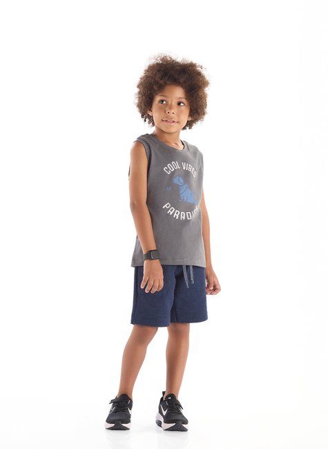 Com estilo casual e frescor para os dias de sol, esta regata infantil masculina é confeccionada em meia malha (Algodão), garantindo toque macio e respirável. A estampa frontal traz a frase Cool Vibes Paradise acompanhada de uma ilustração divertida de cachorro, perfeita para compor looks descontraídos no verão. Possui acabamento da gola em ribana (Algodão) reforçado e bainha com pesponto delicado.