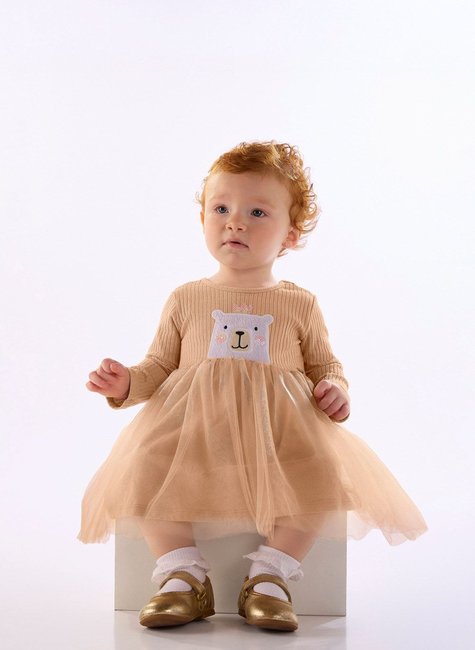 Este vestido para bebê menina é pura delicadeza e conforto. A parte superior é confeccionada em ribana canelada com toque macio e leve elasticidade, enquanto a saia possui duas camadas de tule franzido com forro interno em meia malha, oferecendo volume com suavidade. O modelo conta com manga longa, recorte na cintura com franzido e bordado frontal com aplicação de plaquinha metálica. Ideal para ocasiões especiais ou passeios nos dias frescos.