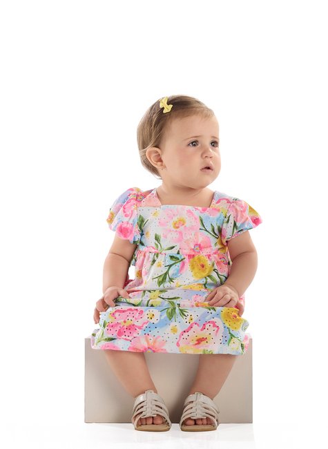 Vestido para bebê menina, confeccionado em malha laise, um tecido leve de toque suave e caimento delicado. O design sofisticado apresenta pala dupla embutida, mangas balonê com elástico e um franzido total na cintura que confere volume e charme. Para garantir o máximo conforto, a peça é inteiramente forrada com malha de algodão. Ideal para passeios, festas e ocasiões especiais, é uma opção que une praticidade, leveza e estilo.