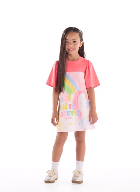 Vestido infantil confeccionado em cotton, garantindo conforto, elasticidade e ótimo caimento. Possui mangas com detalhe franzido, costura reforçada e um recorte estampado com unicórnio e arco-íris, que ganha um brilho especial com a aplicação de strass coloridos. É uma peça versátil e divertida, perfeita para compor produções coloridas e descontraídas em dias ensolarados ou eventos casuais.