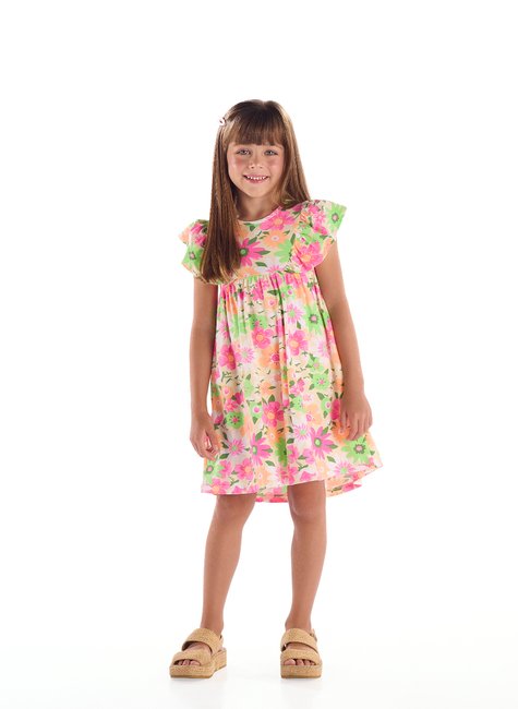 Vestido infantil confeccionado em cotton, um tecido de algodão com elastano que proporciona conforto e flexibilidade, ideal para os dias de calor. Se destaca por um charmoso recorte diagonal franzido no peito e outro na cintura com franzido total. A delicada estampa floral transmite alegria, enquanto as costuras reforçadas garantem resistência para o uso frequente. É a peça ideal para vestir as meninas com frescor, combinando com sandálias ou tênis para um look casual encantador.
