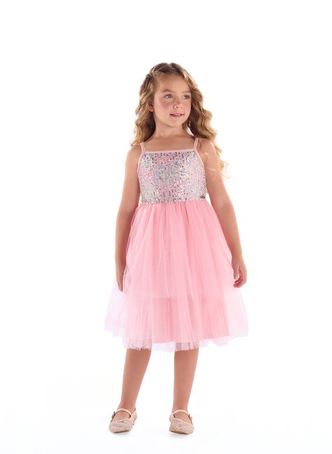 Vestido infantil que une conforto e elegância, ideal para ocasiões especiais. A parte superior, confeccionada em paetê de poliéster com elastano, traz um brilho delicado e conta com alças e uma plaquinha exclusiva da marca. A saia, feita em tule de camada dupla com franzido total, garante leveza e movimento ao look. Para o máximo conforto, tanto a saia quanto a parte superior possuem forro em algodão, e o elástico na cintura oferece um ajuste perfeito. É uma peça encantadora para festas e momentos especiais.