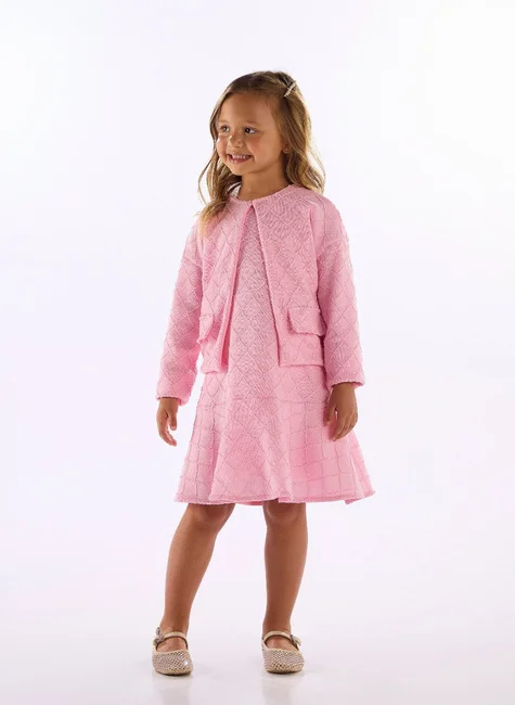 Com um caimento impecável e toque delicado, este vestido infantil é ideal para diversas ocasiões. Confeccionado em malha trabalhada, possui modelagem evasê e forro interno em meia malha 100% algodão, garantindo conforto e acabamento interno perfeito. O detalhe da gota nas costas com botão de metal facilita o vestir e adiciona charme à peça.