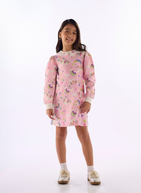 Vestido infantil feminino Quimby confeccionado em cotton leve com toque macio, ideal para os dias mais amenos do inverno. Possui estampa divertida de unicórnios, manga longa e recorte lateral com franzido, unindo conforto e estilo para o dia a dia das pequenas.