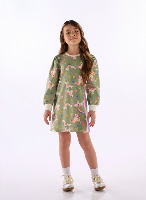 Vestido infantil feminino Quimby confeccionado em cotton leve com toque macio, ideal para os dias mais amenos do inverno. Possui estampa divertida de unicórnios, manga longa e recorte lateral com franzido, unindo conforto e estilo para o dia a dia das pequenas.